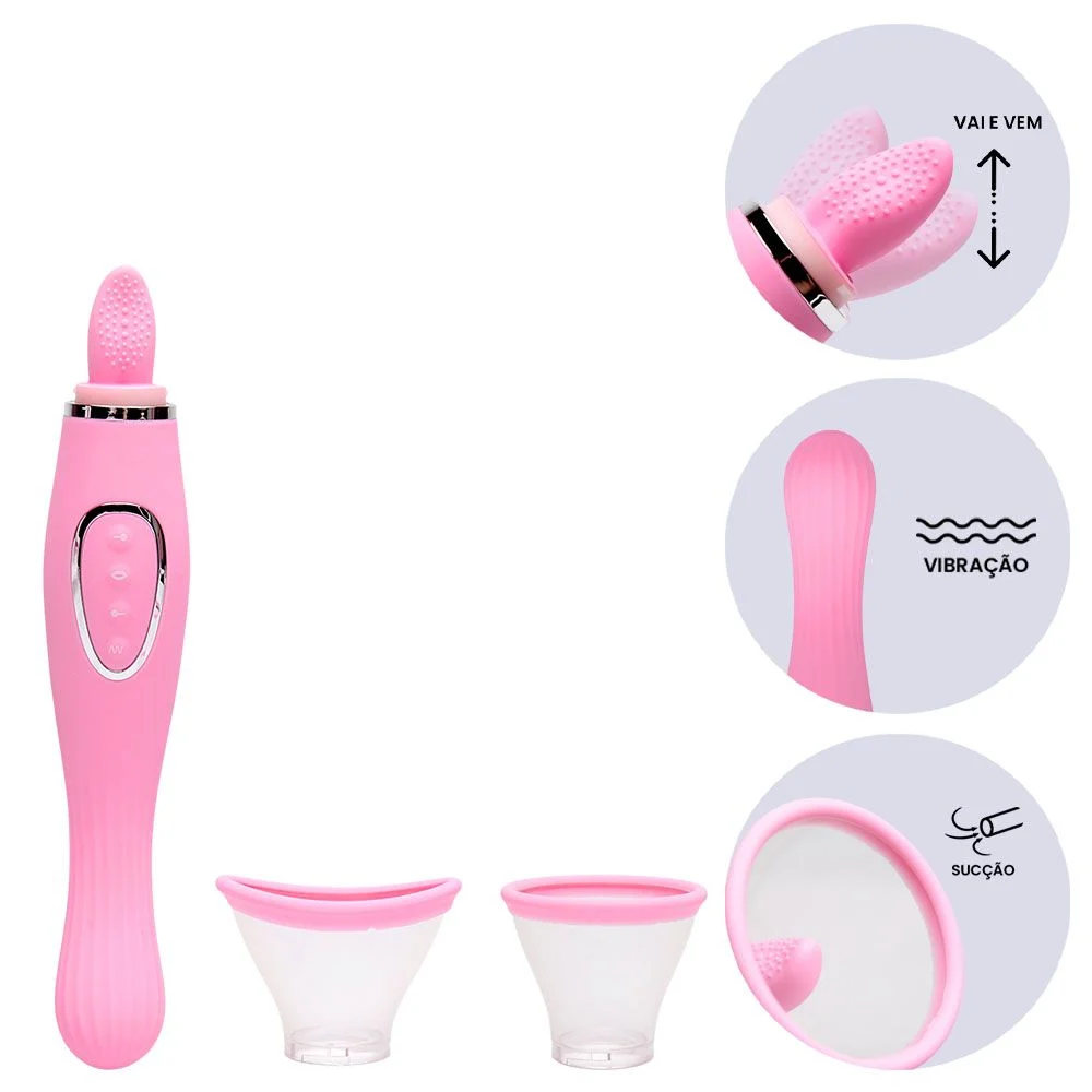 Do outro lado, um simulador de sexo oral com uma língua vibratória que possui 6 modos de vibração e 6 modos de sucção, recriando sensações que imitam um “chups” intenso e ritmado. É estímulo duplo, prazer dobrado, experiência completa.